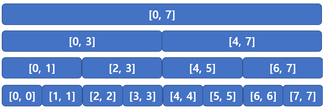 예를 들어, 부모가 구간[0, N-1]을 표현한다면, 그 왼쪽 자식은 [0, (N-1)/2]를, 오른쪽 자식은[(N-1)/2+1, N-1]를 표현한다.