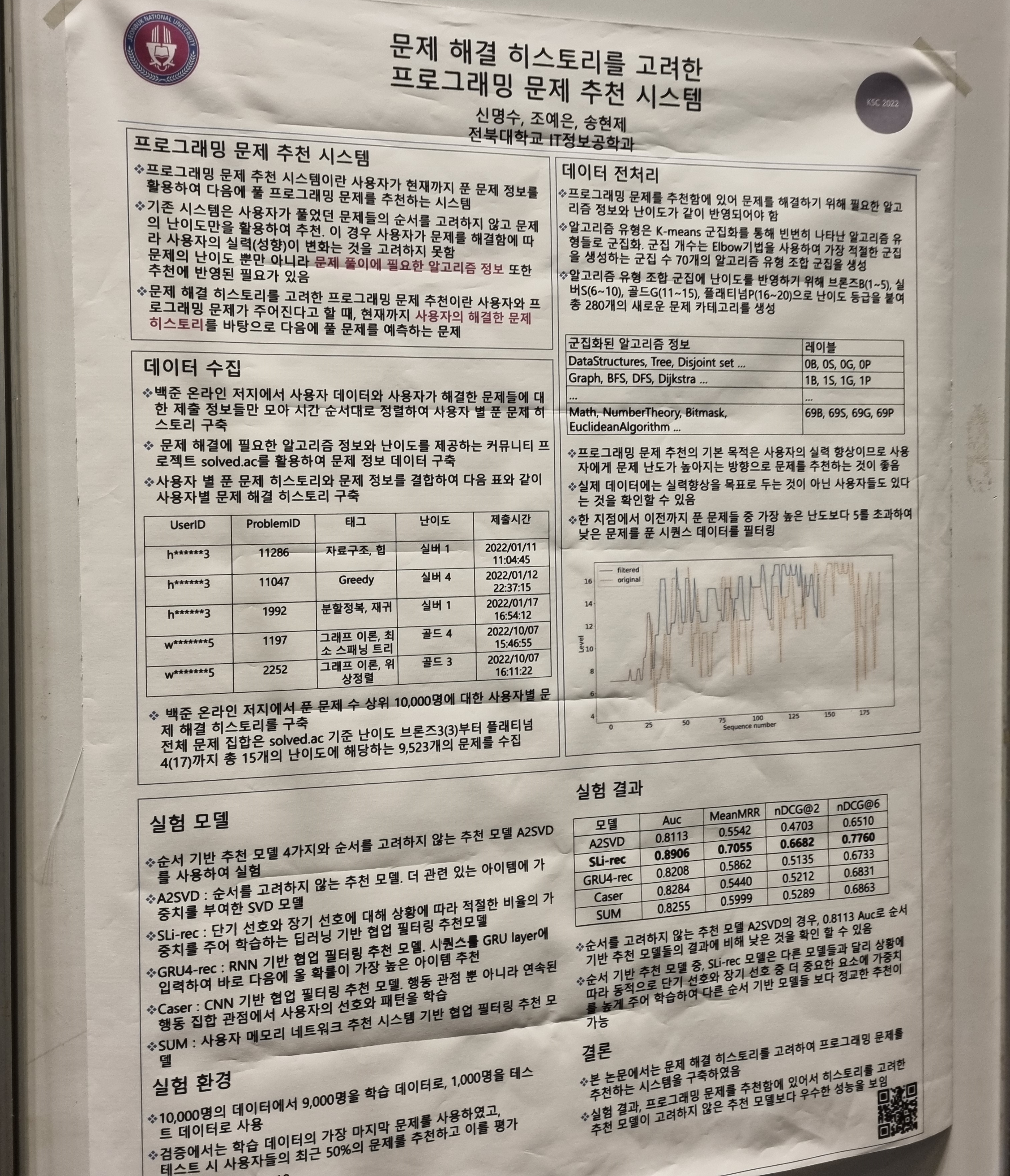 졸업프로젝트 주제는 '프로그래밍 문제 추천'이었는데요. 백준 온라인 저지에서 사람들이 푼 정보들을 크롤링해서 데이터를 구축한 다음 딥러닝 모델을 돌려서 개인화된 프로그래밍 문제를 추천해주는 그런 시스템을 기획했습니다. 프로젝트는 제가 게으른 탓에 저랑 같이 한 친구가 고생을 좀 했습니다. 결론적으로는 성공적으로 프로젝트를 마쳤고, 동계학술대회에 학부생 논문도 냈습니다.