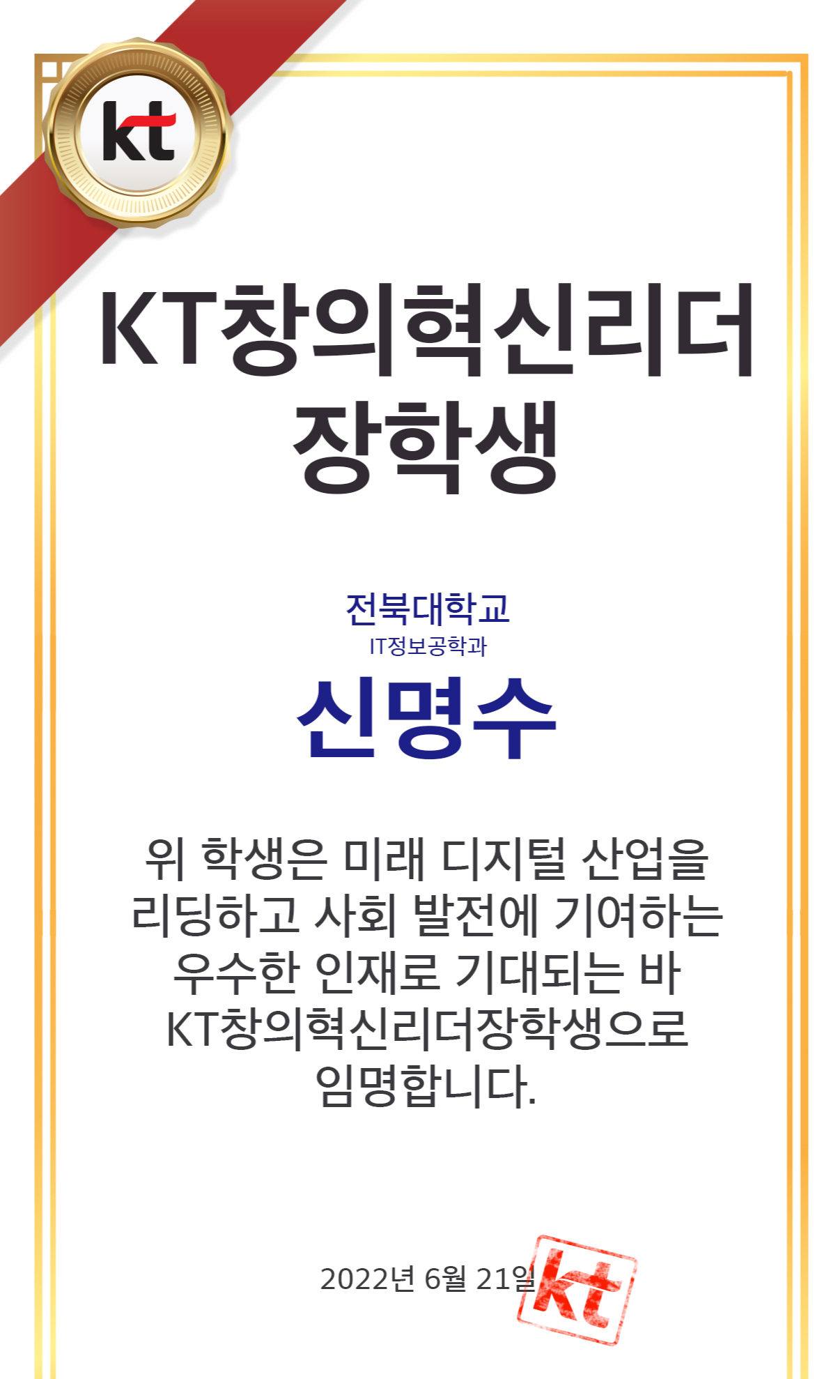 KT창의혁신리더 장학생이 되었습니다.