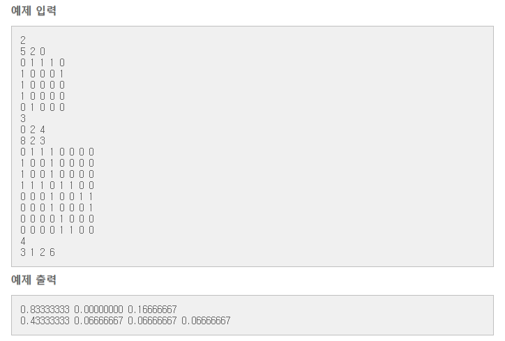 입력의 첫 줄에는 테스트 케이스의 수 c (1 <= c <= 50) 가 주어집니다. 그 후 각 줄에 지도에 포함된 마을의 수 n (2 <= n <= 50) 과 탈출 후 지금까지 지난 일수 d (1 <= d <= 100), 그리고 교도소가 있는 마을의 번호 p (0 <= p < n) 가 주어집니다. 마을은 0번부터 n-1 번까지 순서대로 번호가 매겨져 있습니다. 그 후 n 줄에는 각각 n 개의 정수로 행렬 A 가 주어집니다. i 번 행의 j 번 숫자 A[i][j] 가 1인 경우 i 번 마을에서 j 번 마을을 잇는 산길이 있다는 것을 의미하며, 0인 경우 길이 없다는 것을 의미합니다. 그 다음 줄에 확률을 계산할 마을의 수 t (1 <= t <= n) 가 주어지고, 그 다음 줄에 t 개의 정수로 확률을 계산할 마을의 번호 q (0 <= q < n) 가 주어집니다.