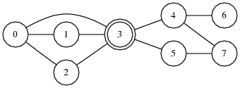 이 가설을 검증하기 위해 교도소로부터 산길로 연결된 n 개 마을들의 지도를 위 그림과 같이 구했습니다. 두니발 박사가 이 가설에 맞춰 행동하고, 움직일 수 있는 마을이 여러 개 있을 경우 그 중의 하나를 임의로 선택한다고 합시다. d 일 후에 두니발 교수가 각 마을에 있을 확률을 계산하는 프로그램을 작성하세요.
