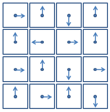 그림과 같이 4 x 4 개의 격자 형태로 배치된 16개의 시계가 있다. 이 시계들은 모두 12시, 3시, 6시, 혹은 9시를 가리키고 있다. 이 시계들이 모두 12시를 가리키도록 바꾸고 싶다.
