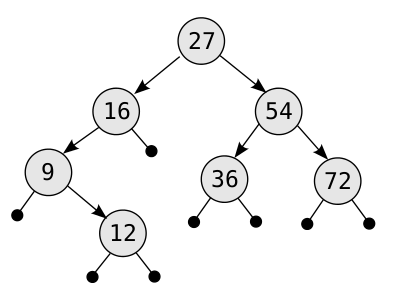 다음 그림은 이진 트리의 한 예를 보여 줍니다. 이 트리를 전위 순회하면 모든 노드를 27, 16, 9, 12, 54, 36, 72의 순서대로 방문하게 됩니다. 반면 중위 순회했을 때는 9, 12, 16, 27, 36, 54, 72의 순서로, 후위 순회했을 때는 12, 9, 16, 36, 72, 54, 27의 순서로 방문하게 되지요.