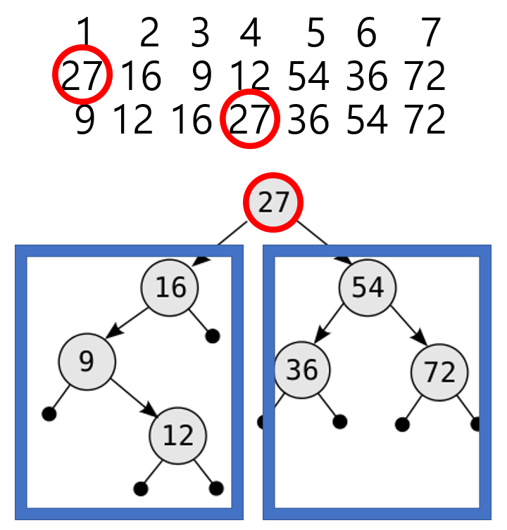 인오더 4번 이 root node 였으니까, 1번부터 3번(9, 12, 16)은 왼쪽 서브 트리, 5번부터 7번(36, 54, 72)은 오른쪽 서브트리가 된다.