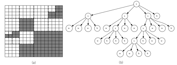 그림 (a)와 그림 (b)는 16×16 크기의 예제 그림을 쿼드 트리가 어떻게 분할해 압축하는지를 보여줍니다. 이때 전체 그림의 압축 결과는 xxwww bxwxw bbbww xxxww bbbww wwbb가 됩니다.