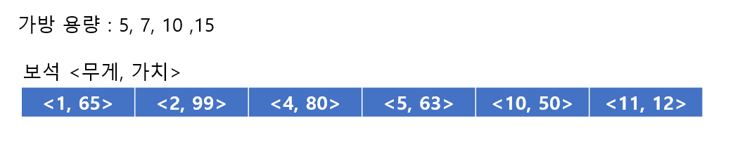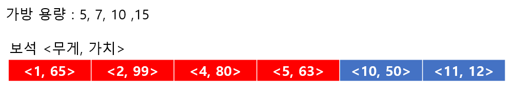 용량이 가장 작은 5부터 보석을 넣는다고 하면,