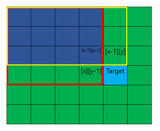 DP[x-1][y-1]을 빼고 해당 자리의 값을 더하면 DP[y][x] = (1, 1) 부터 (x, y) 까지의 합이 된다.